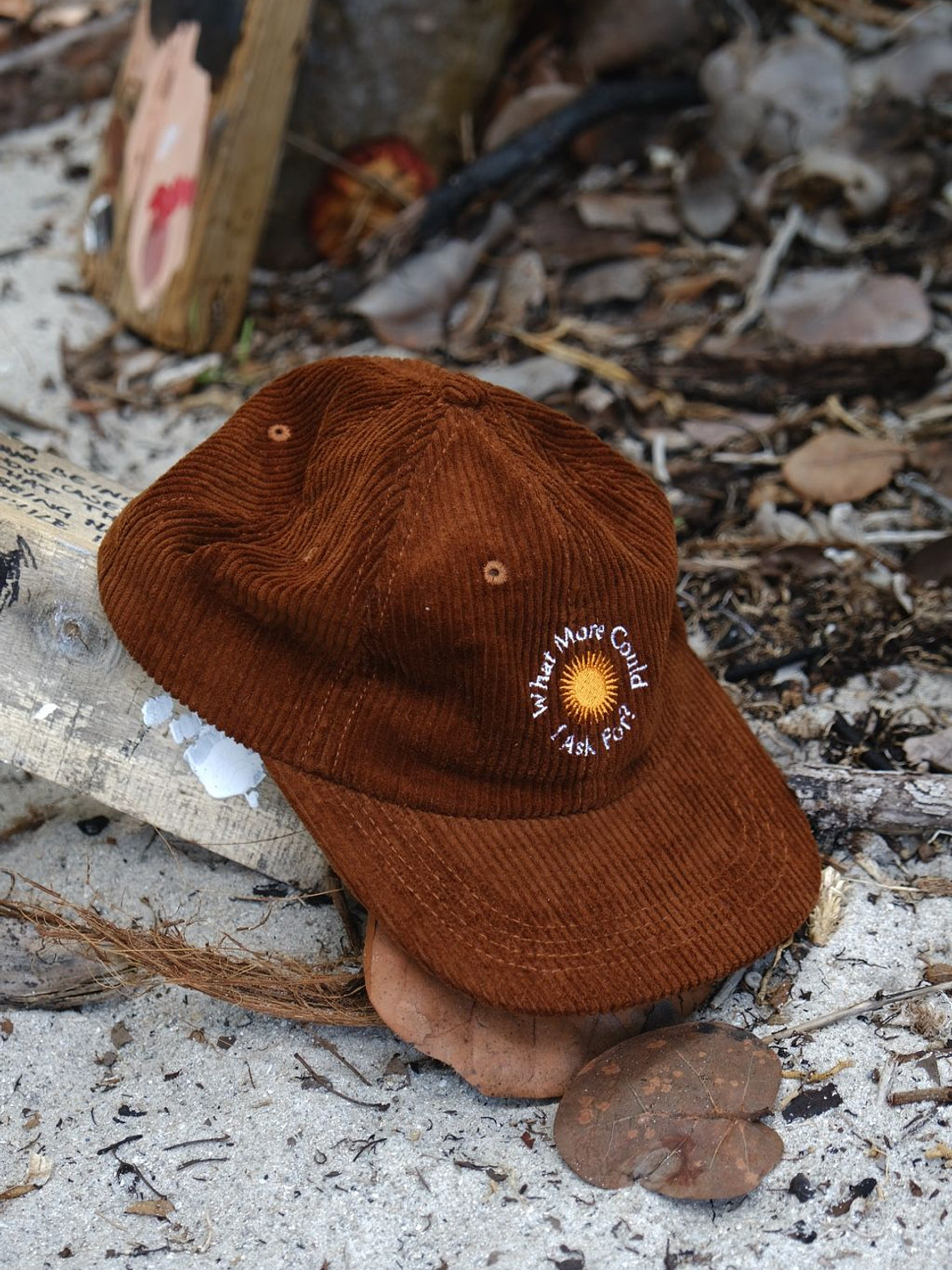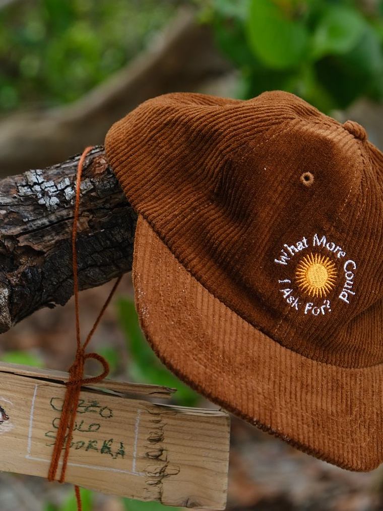 ¿What More Could I Ask For? representa gratitud y conexión con lo esencial: el sol, el mar y la vida al aire libre. Confeccionado en cotelé café y bordado con un sol radiante, transmite la calidez de la naturaleza y la vibra tranquila del surf. Un accesorio auténtico y versátil que acompaña cada aventura, recordándote que a veces lo simple es todo lo que necesitas.